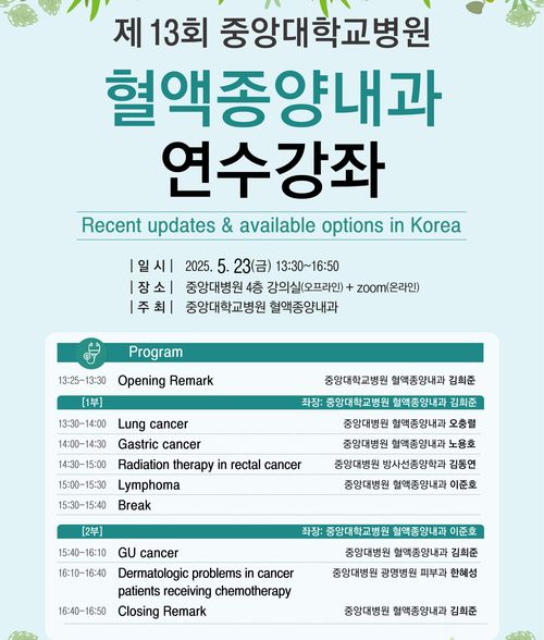 1부 세션에서는 ▲폐암(혈액종양내과 오충렬 교수) ▲위암(혈액종양내과 노용호 교수) ▲직장암의 방사선요법(방사선종양학과 김동연 교수) ▲림프종(혈액종양내과 이준호 교수) 치료에 대해 강연한다. 2부 세션에서는 ▲비뇨생식기계암(혈액종양내과 김희준 교수) ▲항암화학요법 후 피부 부작용 관리(중앙대광명병원 피부과 한혜성 교수) 강연으로 진행된다.