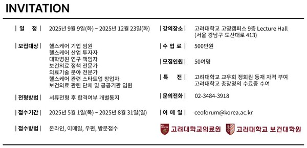 모집 대상은 헬스케어 기업 임원, 관련 산업 투자자, 대학병원 연구 책임자, 의료기술 분야 전문가, 보건의료 정책 전문가와 공공기관 임원 등이며 강의는 2025년 9월 9일부터 2025년 12월 23일까지 매주 화요일, 고대의료원 고영캠퍼스 9층 Lecture Hall에서 총 15주간 진행된다.