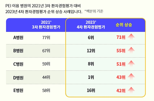 실제로 지난해 발표된 건강보험심사평가원 4차 환자경험평가 결과를 보면 3차 평가 대비 PEI 솔루션 이용 병원의 환자경험평가 순위가 많이 상승한 것으로 나타났다.