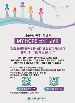 서울아산병원은 이러한 젊은 암 환자들의 신체적 정신적 회복을 지원하고 암 극복을 위한 도전을 응원하고자 ‘MY HOPE’ 운동 크루를 모집한다.