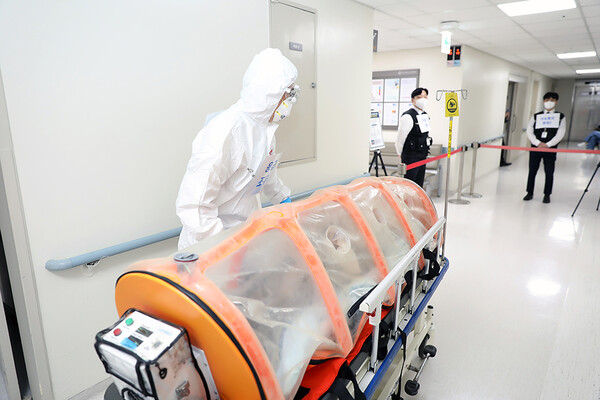 훈련은 병원 내 주요 진료 및 간호, 지원부서가 단계별로 참여해 ▲응급실과 1층 외래를 시작으로 ▲약제부·원무부·진단검사의학과 검사실 ▲응급실·중환자실·영상의학과 ▲중환자실·12층 병동·영상의학과·영안실 등으로 이어졌다. 실제 환자 발생 상황을 가정해 환자 분류, 격리조치, 검사·투약·이송 등 대응 절차 전반을 종합적으로 점검했다.