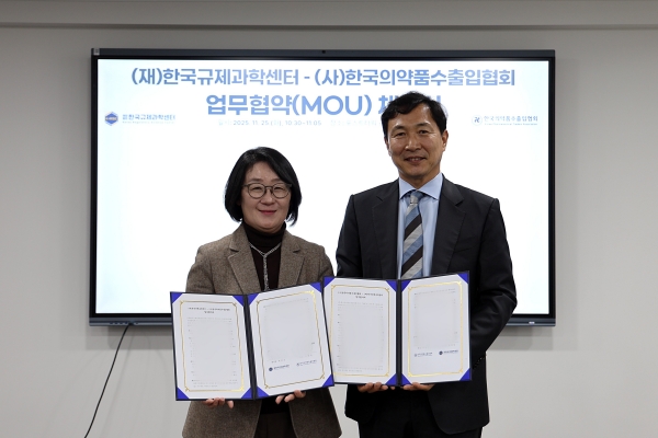[라포르시안] 한국규제과학센터(이하 센터·센터장 박인숙)는 한국의약품수출입협회(이하 협회·회장 류형선)와 25일 서울 포스트타워 규제과학 아카데미에서 규제과학과 대한민국약전 발전을 위한 업무협약을 체결했다.